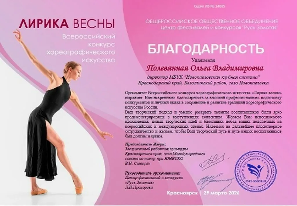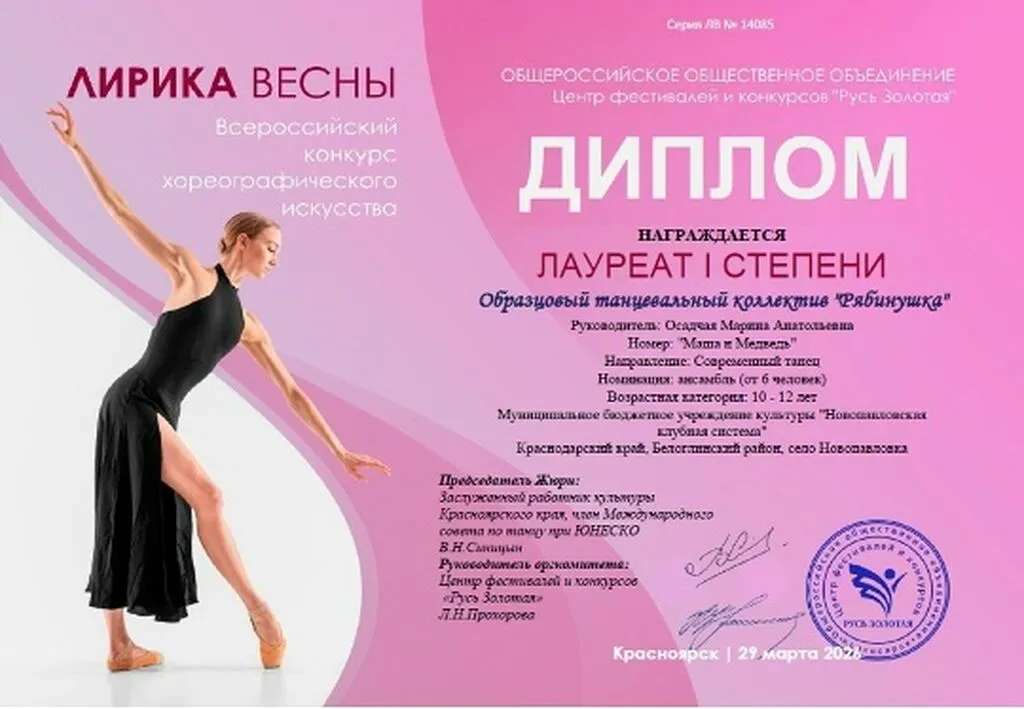 Образцовый хореографический коллектив «Рябинушка» СДК с. Новопавловка стал лауреатом I степени на Всероссийском конкурсе хореографического искусства «Лирика весны»!