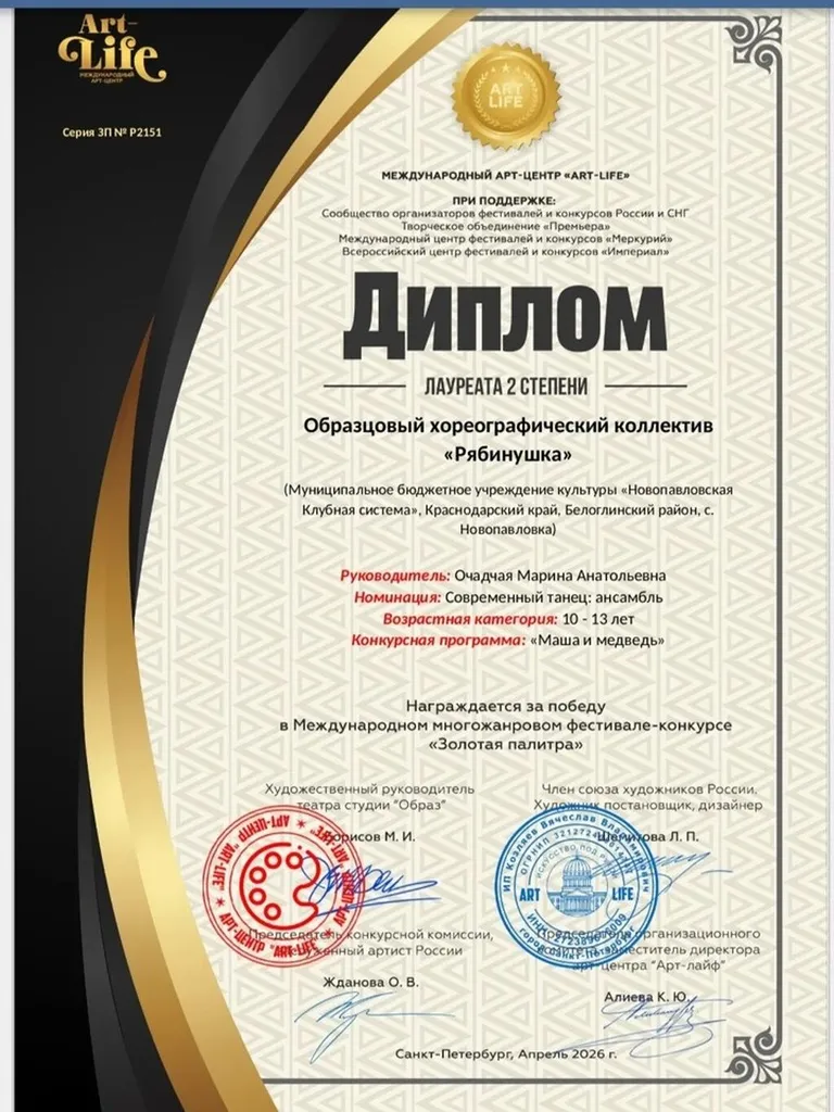 Их озорной танец "Маша и Медведь" награждён Диплом Лауреата 2 степени на Международном многожанровом фестивале-конкурсе «Золотая палитра»!